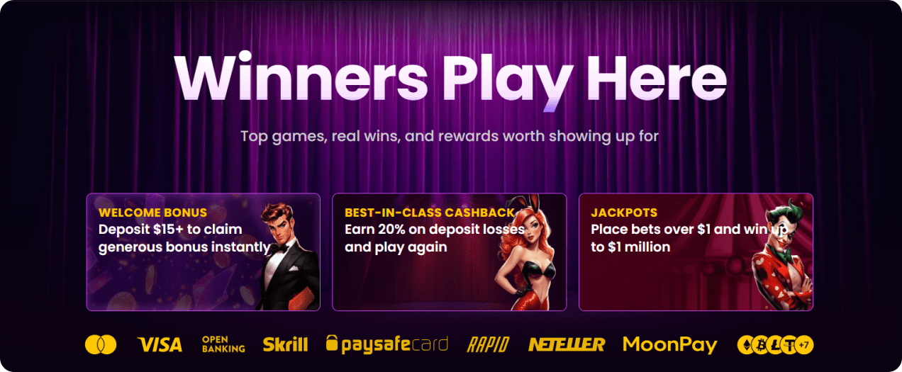 Withdrawals are available via cards, e-wallets, crypto, or bank transfer.